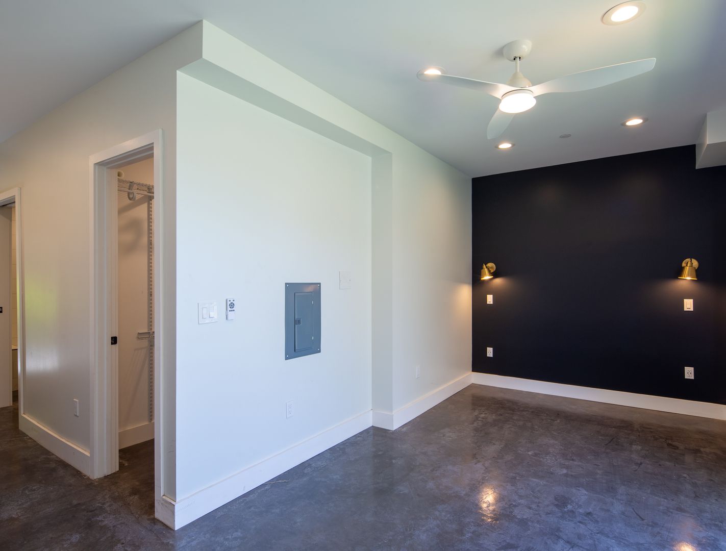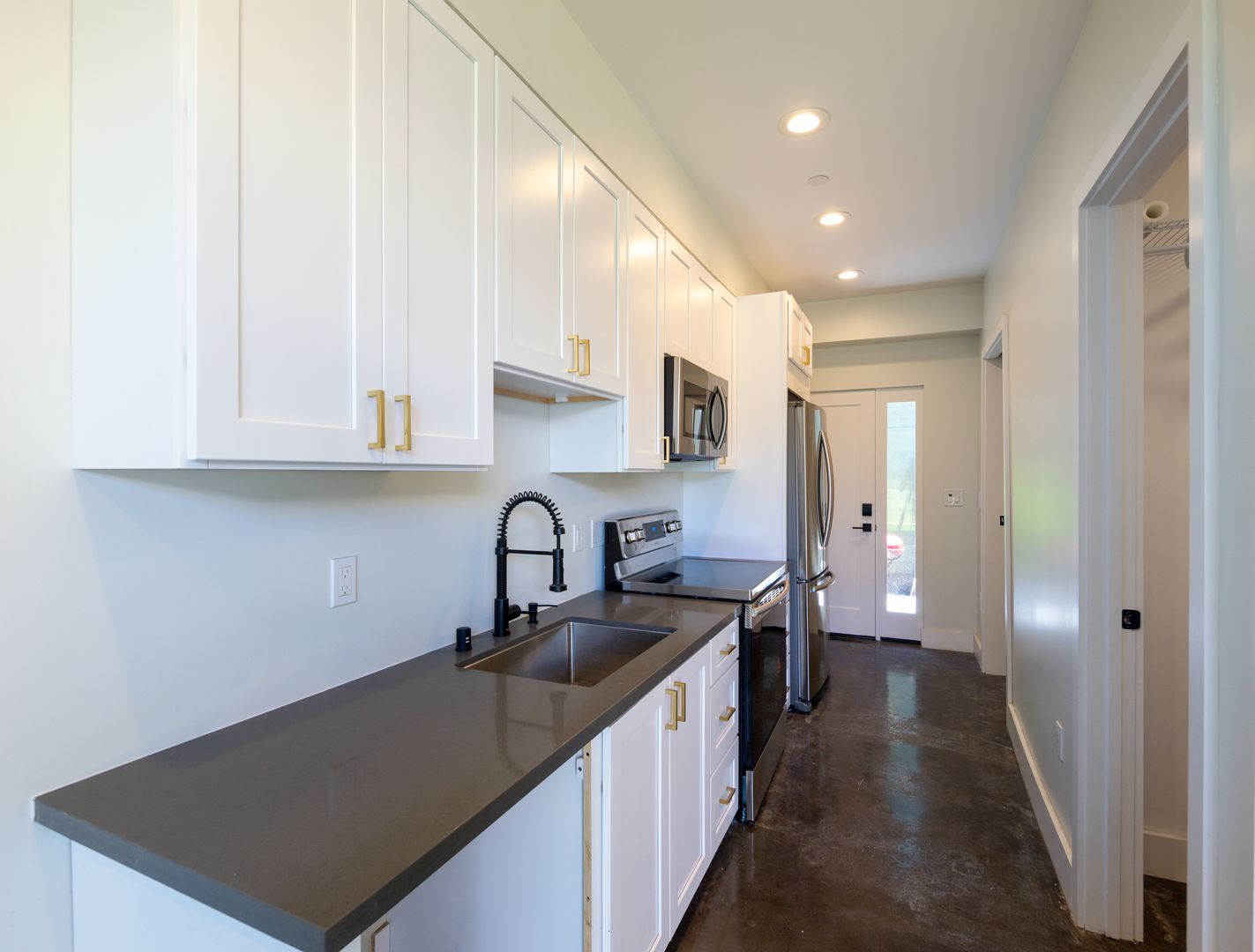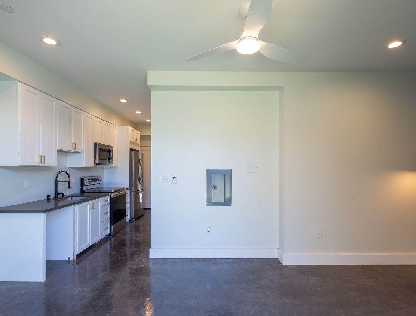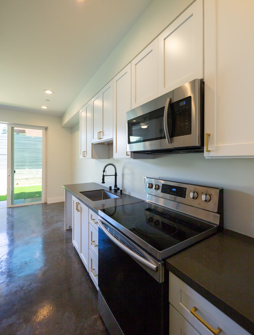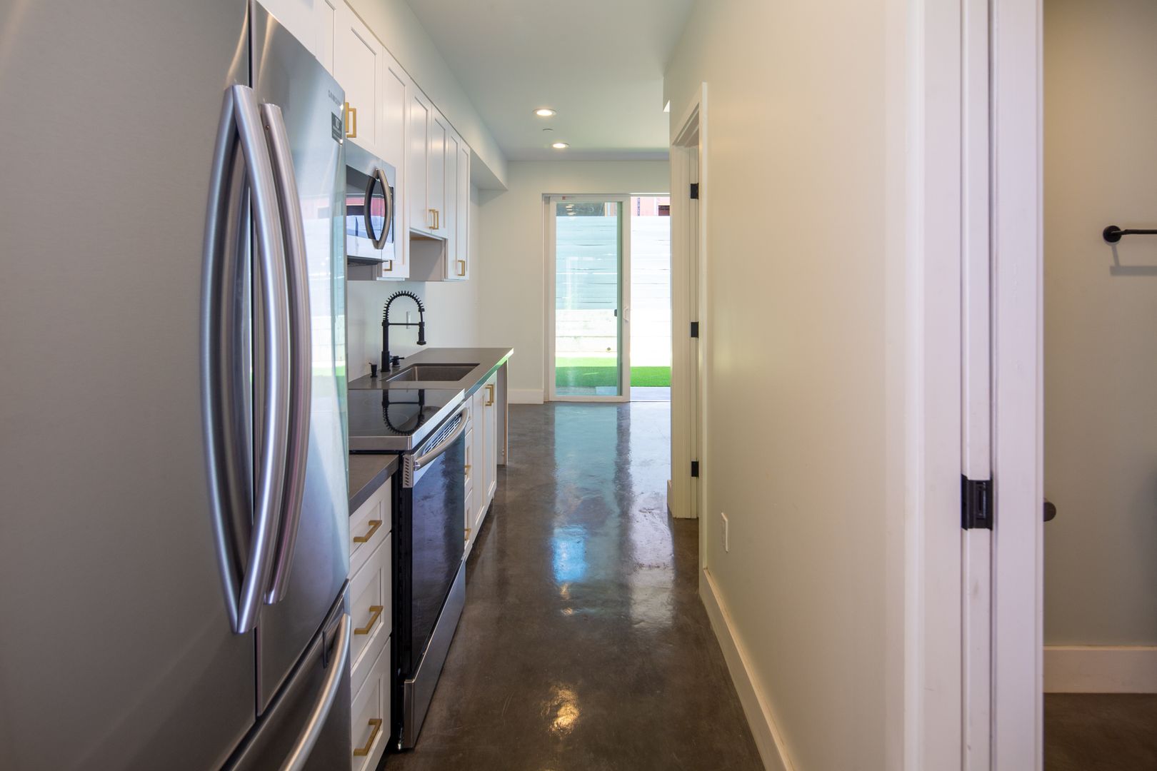 Kitchen & Appliances: Modern kitchen and High Ceilings , Sleek Concrete Floors